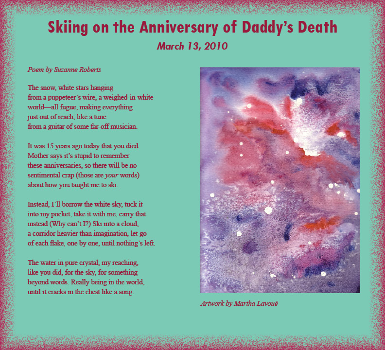 Suzanne Roberts' poetry books include Shameless (2007), Nothing to You (2008), Three Hours to Burn a Body: Poems on Travel (2011), and Plotting Temporality (forthcoming from Pecan Grove Press, 2012). Her memoir, Almost Somewhere: Twenty-Eight Days on the John Muir Trail, is forthcoming from the University of Nebrasks Press in 2012. She currently teaches at Lake Tahoe Community College in South Lake Tahoe, California and for the low residency MFA Creative Writing program at Sierra Nevada College in Incline Village, Nevada. For more information, please visit her website at www.suzanneroberts.org