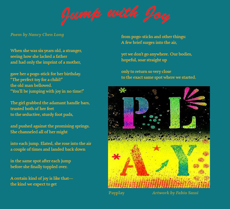 Nancy Chen Long's work has recently appeared, or is forthcoming, in Roanoke Review, The New Sound: A Journal of Interdisciplinary Art & Literature, Weave Magazine, and Two Hawks Quarterly, and has been nominated for a Pushcart prize and the 2012 AWP Intro Journals Project.