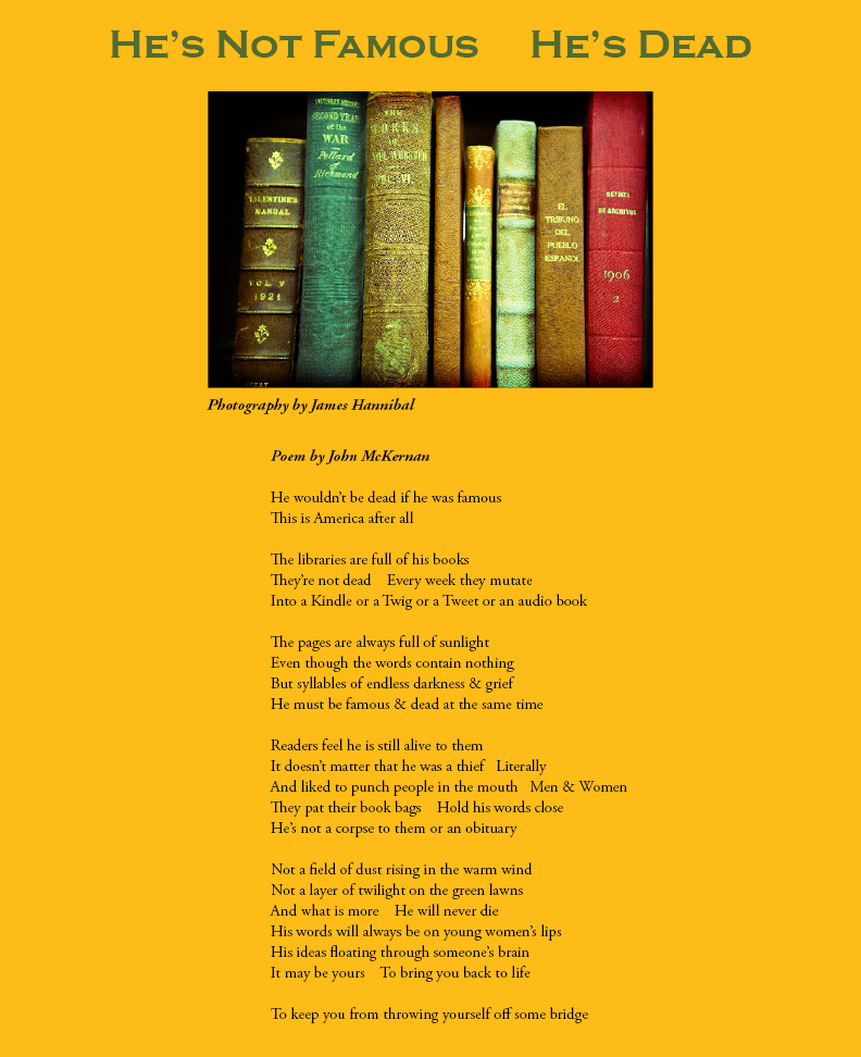 John McKernan grew up in Omaha Nebraska and is now a retired comma herder after teaching 41 years at Marshall University. He lives mostly in West Virginia where he edits ABZ Press. His most recent book is a selected poems Resurrection of the Dust. He has published poems in The Atlantic Monthly, The Paris Review, The New Yorker, Virginia Quarterly Review and many other magazines.