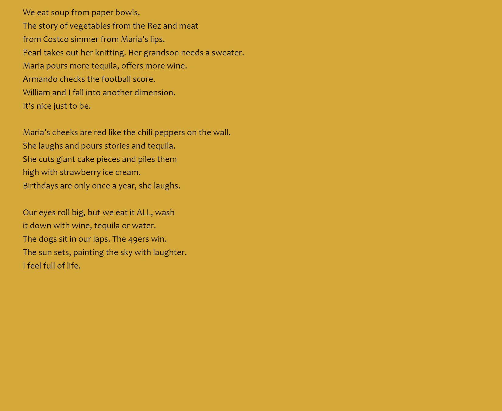 In 1997 Mediha Saliba published her first book, "Shadows of the Puppet," and in 2000 a novella, "Stone Secrets, a Journey with Rheumatoid Arthritis." Since then Saliba has devoted herself to poetry, self-publishing her first book of poems, "Holding Up the Moon" in 2008. She has published poems in Cyclamen and Swords, winning a "Highly Commended" award two years in a row. She has also published poetry in Aurorean, Sage Trail, Rattlesnake Review, Main Channel Voices, Seven Circle Press, and others. She lives in Northern California with her husband, preferring the simple life of a small community, and enjoying the company of grandchildren.