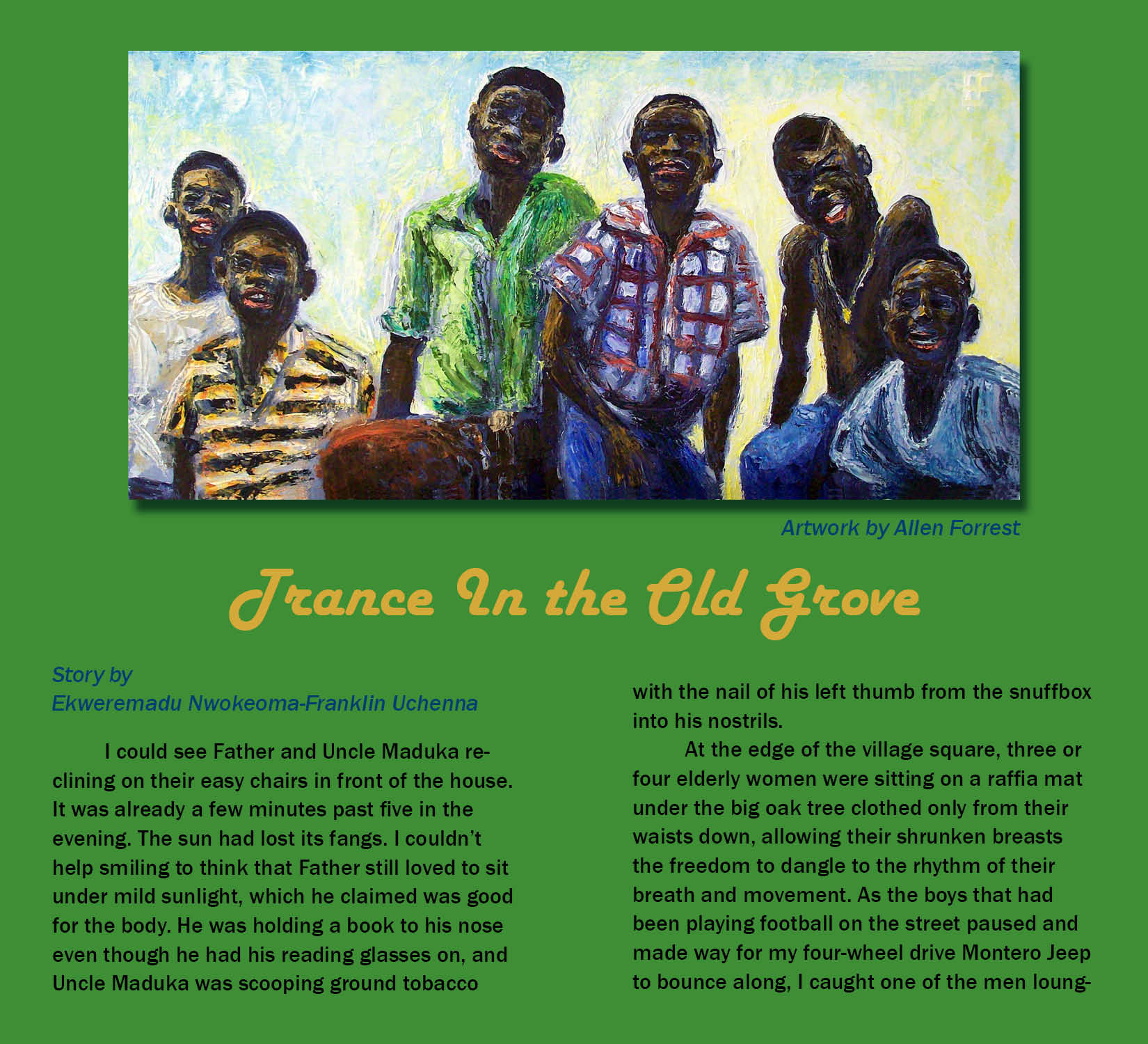 Ekweremadu Nwokeoma-Franklin Uchenna lives in Kaduna City of Nigeria. Apart from prose, he also writes poetry and plays. His works have appeared in Saraba Literary Magazine, Sentinel Nigeria Literary, A&U American Aids Magazine, Flashquake, Wilderness House Literary Review, and elsewhere.