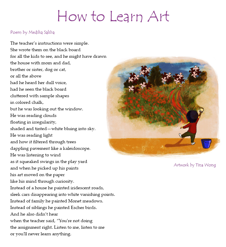 Mediha Saliba has been writing poetry for over twenty-five years, and has published in several literary/art journals and online in the U.S. as well as Australia and Israel. She makes her home in rural Northern California where she is President of Studio 299-Center for the Arts, a non-profit organization for local artists.