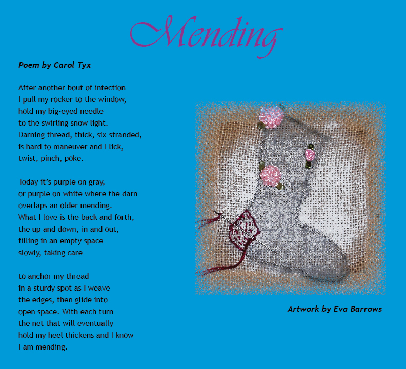 Carol Tyx teaches writing and American literature at Mt. Mercy University in Cedar Rapids, Iowa. Her work has most recently been published in Hunger Mountain, Big Muddy, Earth's Daughters, Iowa City's Poetry in Public, and Rising to the Rim, published by Brick Road Poetry Press.