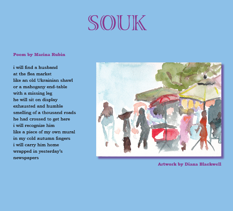 Diana Blackwell is a self-taught artist in Berkeley, California. She works in charcoal, acrylics, collage, printmaking, and watercolor. She belongs to the East Bay Figure Painters. She has shown work all over the Bay Area and has illustrated books and stories. Her online gallery is www.zhibit.org/diana_blackwell.