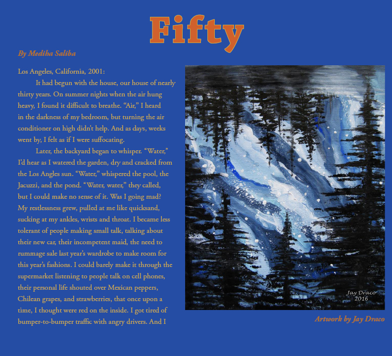 Mediha Saliba is an international poet and writer, living in Northern California. She has published two nonfiction books, Shadows of the Puppet (Santa Barbara Review Press) and Stone Secrets (StonePeople's Press). She is president of Studio 299-Center for the Arts, where she helps promote art and art education.