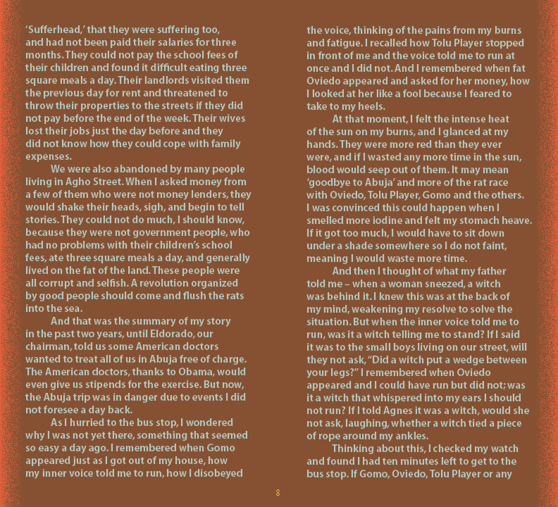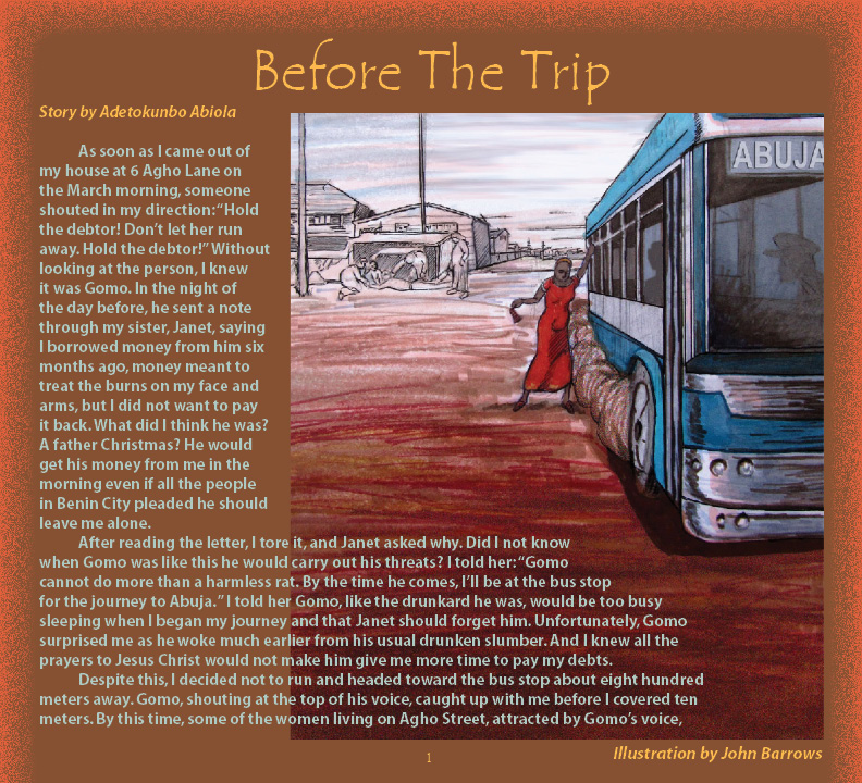 Adetokunbo Abiola is a Nigerian journalist and writer. He has published LABULABU MASK, a novel (Macmillan Nigeria). He has also published in print and online magazines such as Rake Journal, BBC Focus on Africa Magazine, Flask Review, Zapata!, Liberation Lit, Sage of Consciousness Review, AfricanWriter.com, Big Pulp, the One World anthology, The November 3rd Club, Mobius - A Journal for Social Change, Dog Eat Crow Magazine, Contemporary World Literature Journal, Bicycle Review, May Day Magazine, Pulse Literary Review and the Mainstay Press Anthology. One of his stories is about to be published in Wilderness House Literary Review.