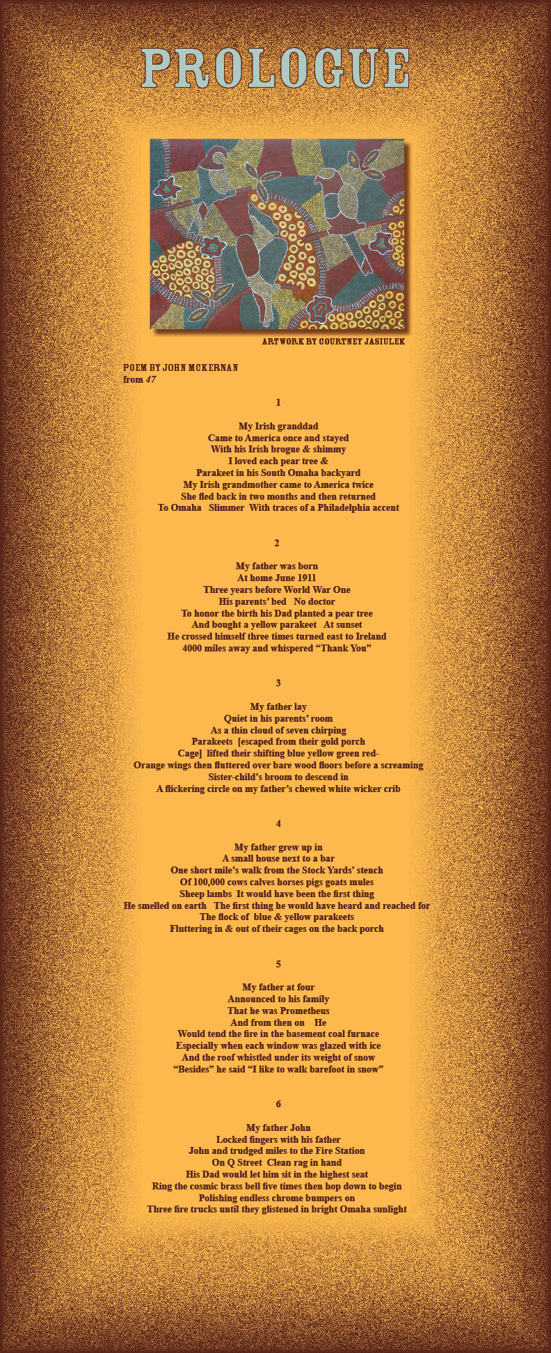 John McKernan is now a retired comma herder. He lives mostly in West Virginia where he edits ABZ Press. His most recent book is selected poems Resurrection of the Dust. He has published poems in The Atlantic Monthly, The Paris Review, The New Yorker, Virginia Quarterly Review and many other magazines. PROLOGUE is the introductory poem in a collection of poems about John McKernan's father with the title 47 which is desperately seeking a publisher.