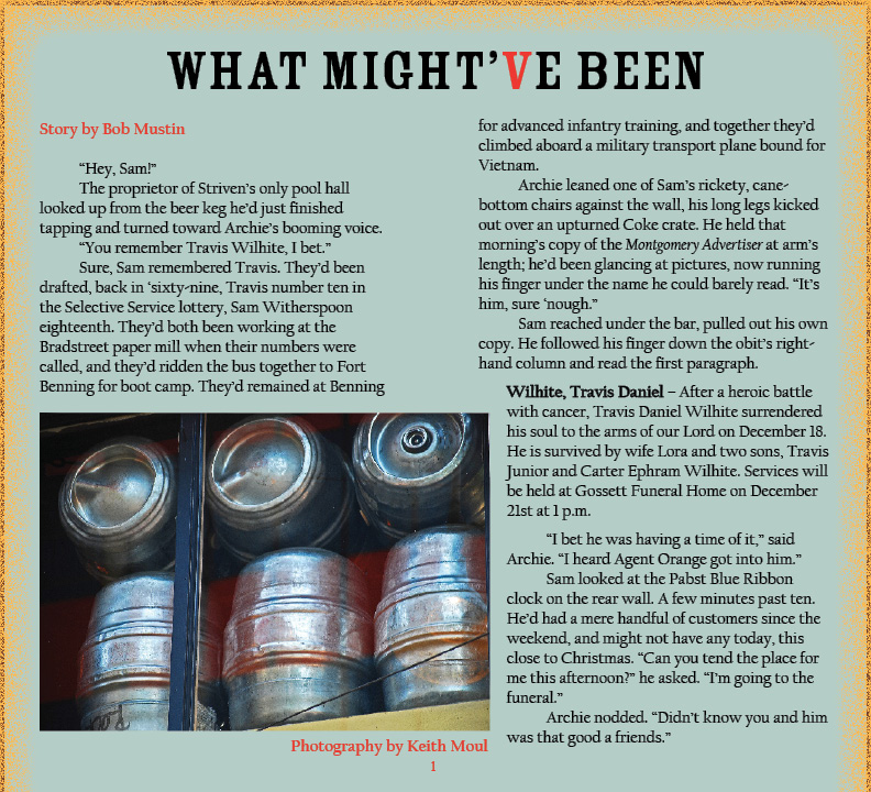 Bob Mustin had a brief naval career and a longer one as a civil engineer, and has been a North Carolina Writers Network writer-in-residence at Peace College under Doris Betts' guiding hand. In the early ' 90s, he was the editor of a small literary journal, The Rural Sophisticate, based in Georgia. His work has appeared in The Rockhurst Review, Elysian Fields Quarterly, Cooweescoowee, Under The Sun, Gihon River Review, Reflections Literary Journal, thesquaretable.com, raving dove, Sport Literate, The Externalist, Language and Culture, and R.KV.R.Y in electronic form.