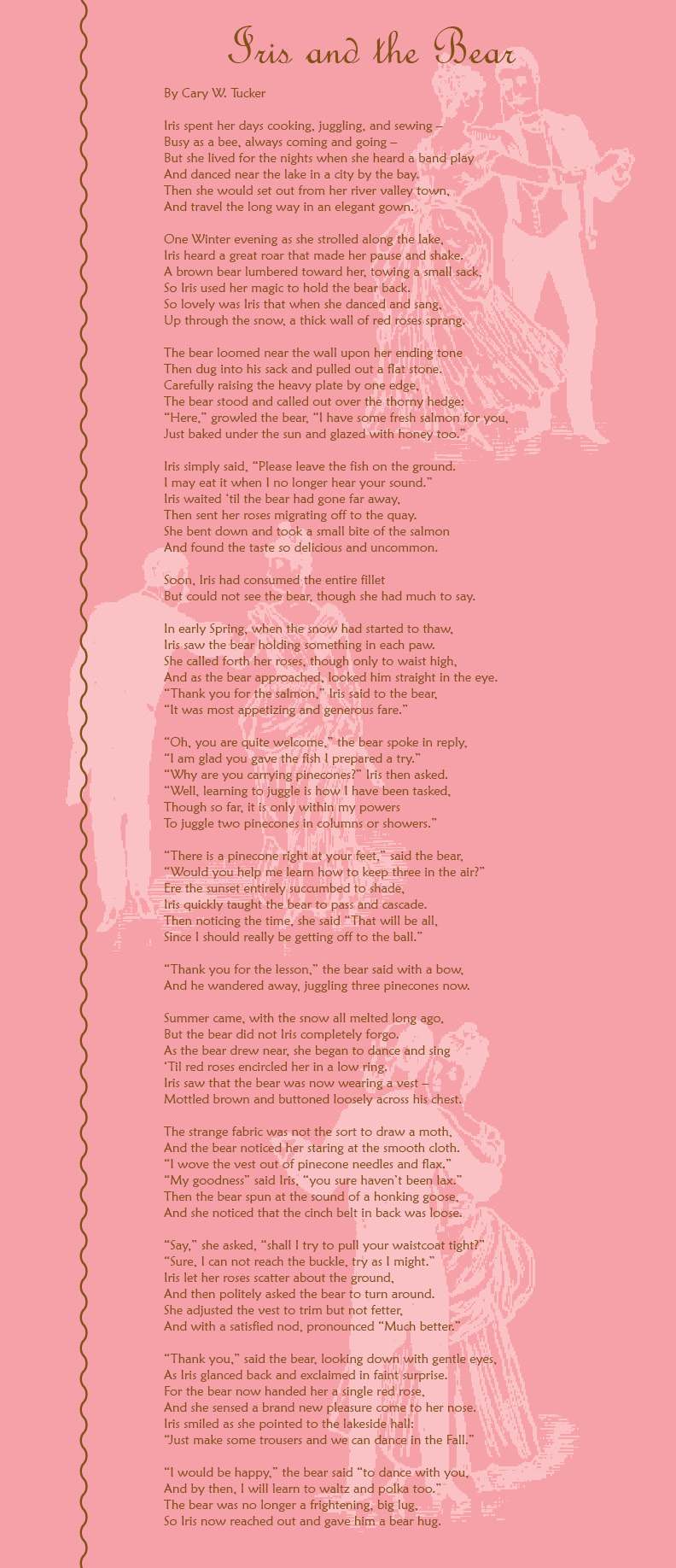 Cary W. Tucker has not actually tried cooking honey glazed salmon and can scarcely juggle; however, he has learned how to sew a basic vest together. Iris and the Bear was influenced in part by the Grimms fairy tale, Snow White and Rose Red, but was primarily inspired by a dance at a Gaskell Ball with a lovely woman wearing a pale gown decorated with large, red roses. See more of his poetry at: www.carywtucker.com.