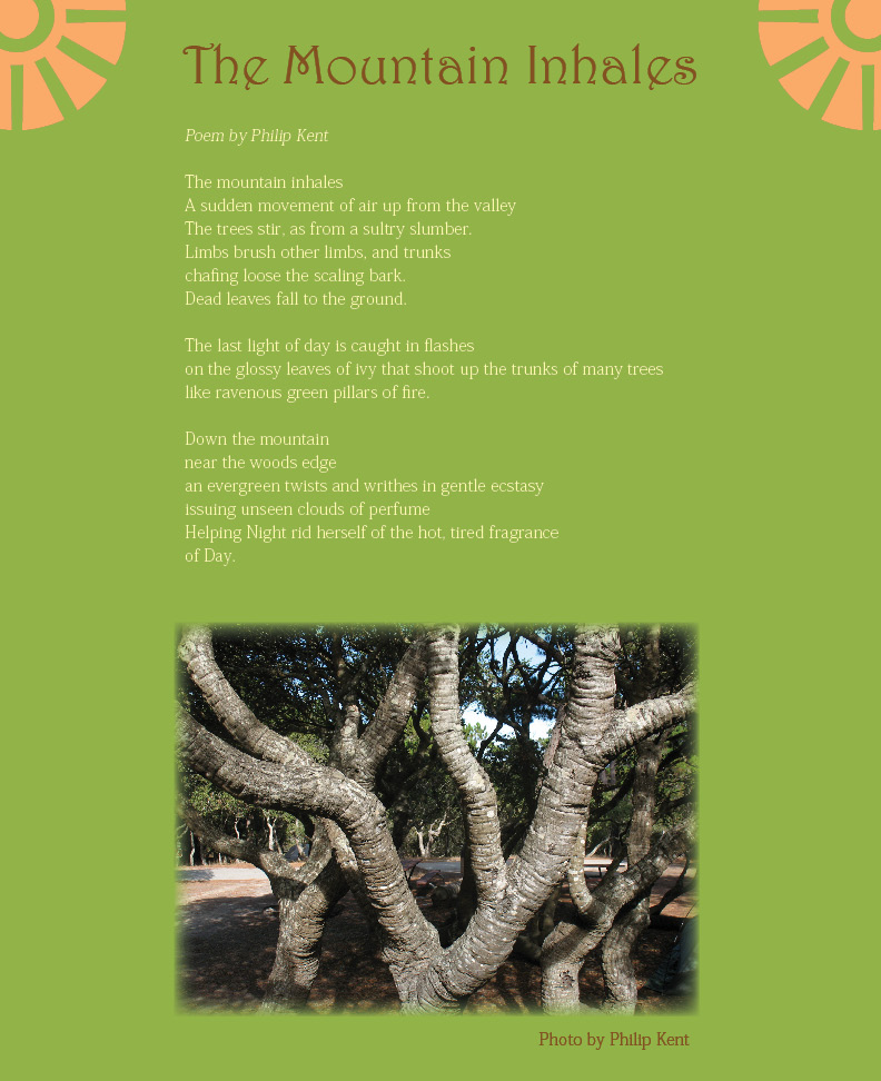 Philip is an avid cyclist, and cycle tourist and is a one time editor of a Cycling newsletter. He finds that, "Driving and cycling have taken me to many enchanted places in California, and trees have always been a source of inspiration both in poetry and photography."