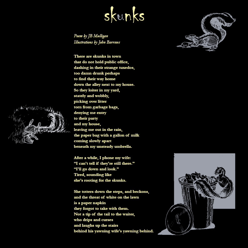 JB Mulligan has had poems and stories in dozens of magazines, including recently, Thirty First Bird Review, Seven Circle Press, Blue Fifth Review, The Lyric, and Spark Bright, and two chapbooks: The Stations of the Cross and THIS WAY TO THE EGRESS, and has appeared in the anthology Inside Out: A Gathering of Poets.